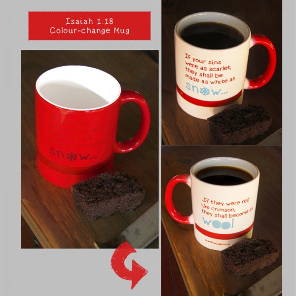 Don’t know about you but I could sure use a constant reminder of God’s grace and forgiveness… This multi-talented mug changes from red to white when filled with boiling water, reminding us how the blood of Jesus completely washes away our sins according to Isaiah 1:18: “If your sins were as scarlet, they shall be made as white as snow… If they were red like crimson, they shall become as wool”.